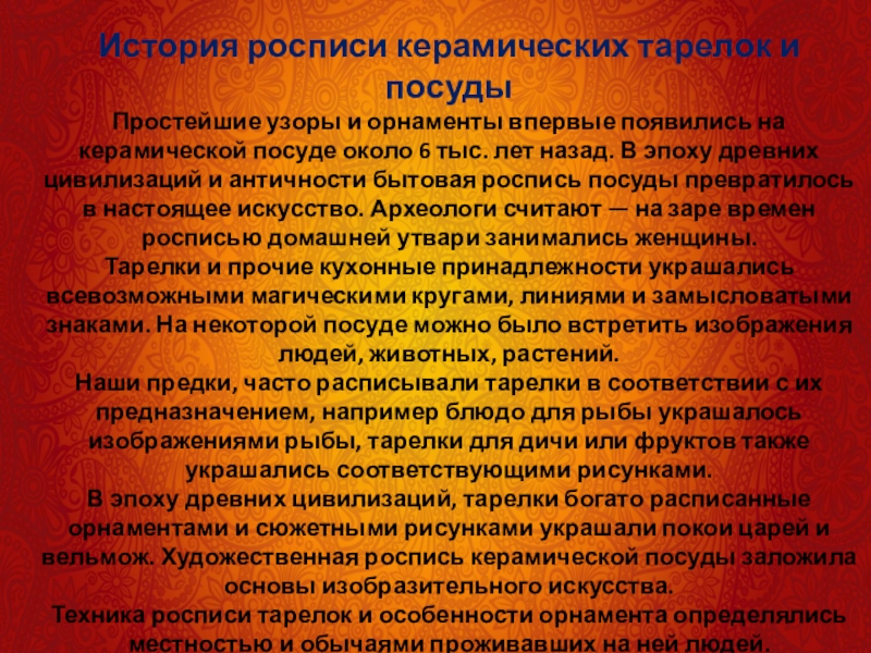 на керамической посуде около 6 тыс. лет назад. В эпоху древних цивилизаций и античности бытовая роспись посуды превратилось в настоящее искусство. Археологи считают — на заре времен росписью домашней утвари занимались женщины.