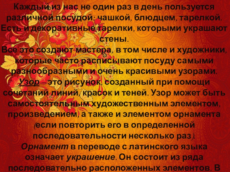 Орнамент в переводе с латинского языка означает украшение. Он состоит из ряда последовательно расположенных элементов. В этом случае обязательно соблюдается строгая закономерность, связанная с симметрией и ритмом. Орнамент придает изделию выразительность, красоту, подчеркивает его форму и фактуру.