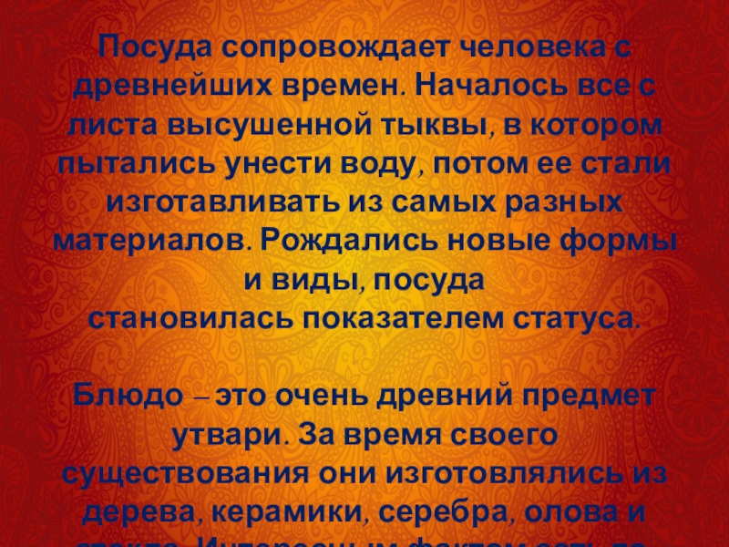 тыквы, в котором пытались унести воду, потом ее стали изготавливать из самых разных материалов. Рождались новые формы и виды, посуда становилась показателем статуса.