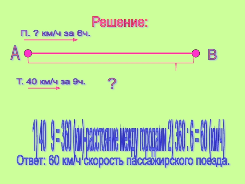 1) 40 9 = 360 (км)-расстояние между городами 2) 360 : 6 = 60 (км/ч)