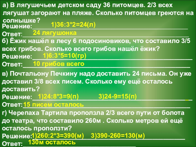 в) Почтальону Печкину надо доставить 24 письма. Он уже доставил 3/8 всех писем. Сколько ему ещё осталось доставить? Решение:____________________________________________ Ответ:______________________________________________