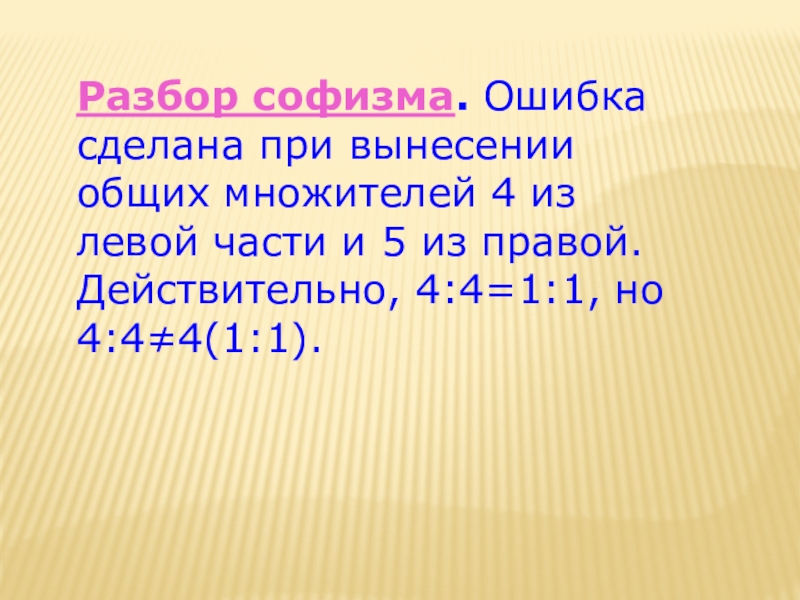 Слайд 15Разбор софизма. Ошибка сделана при вынесении общих множителей 4 из левой