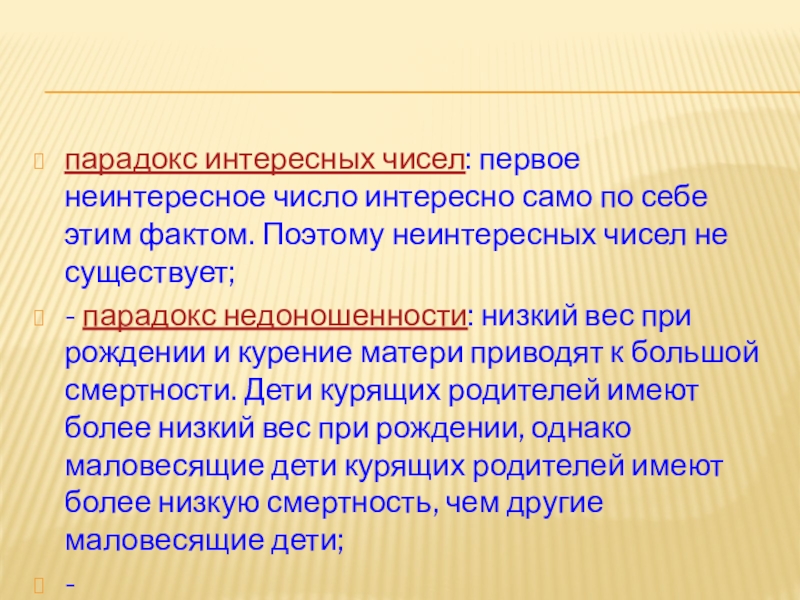 - парадокс недоношенности: низкий вес при рождении и курение матери приводят к большой смертности. Дети курящих родителей имеют более низкий вес при рождении, однако маловесящие дети курящих родителей имеют более низкую смертность, чем другие маловесящие дети;
