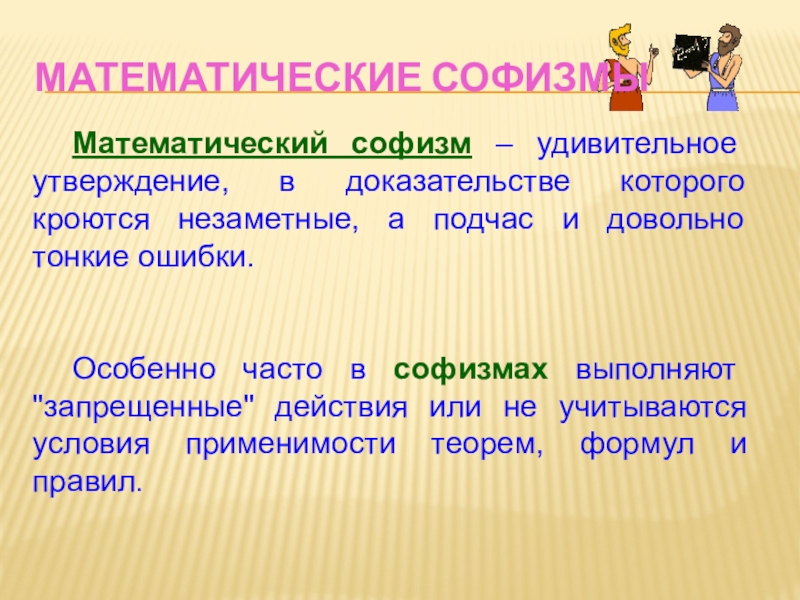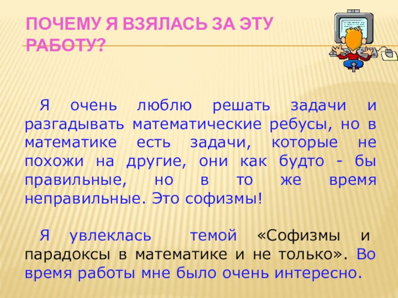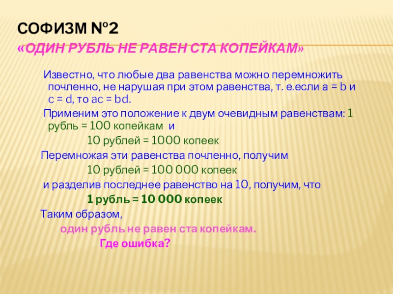разгадывать математические ребусы, но в математике есть задачи, которые не похожи на другие, они как будто - бы правильные, но в то же время неправильные. Это софизмы!