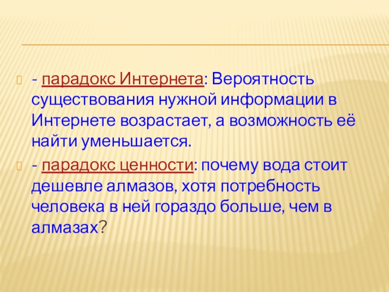 Слайд 24- парадокс Интернета: Вероятность существования нужной информации в Интернете возрастает, а