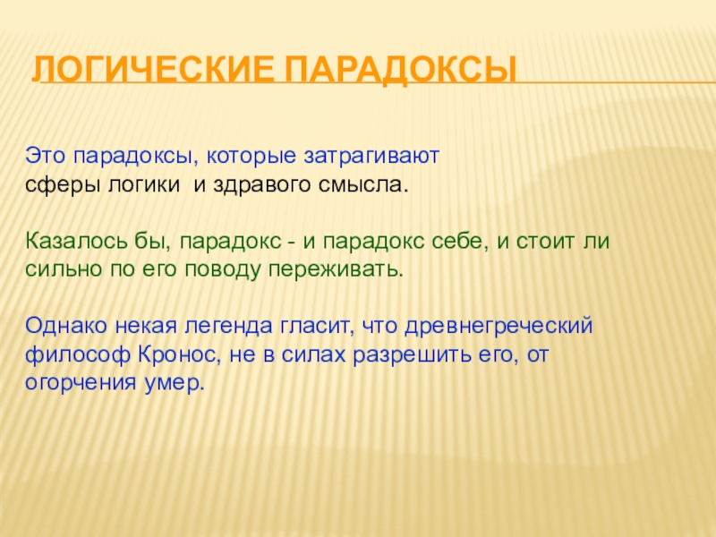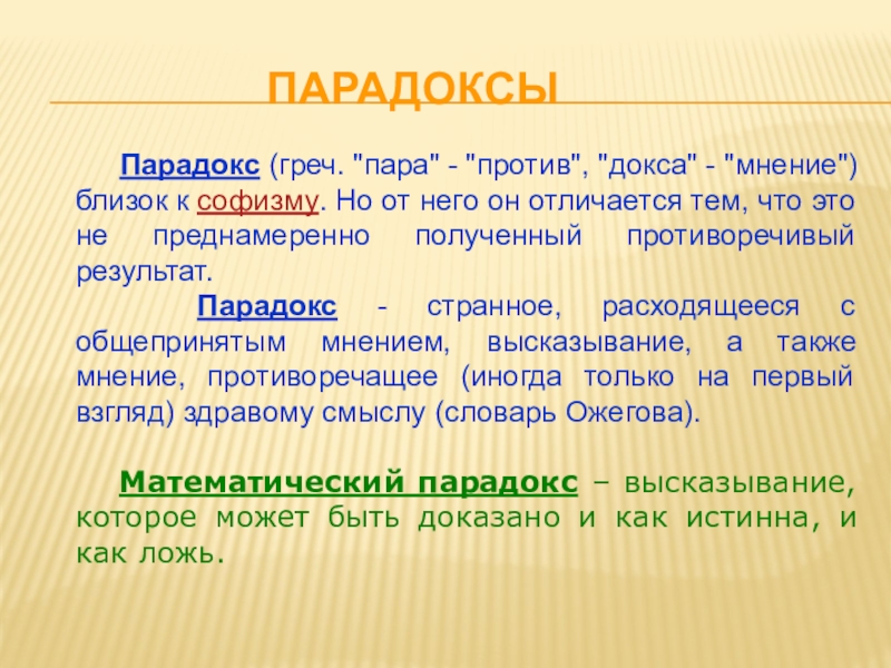 Слайд 21 Парадокс (греч. "пара" - "против", "докса" - "мнение") близок к софизму.
