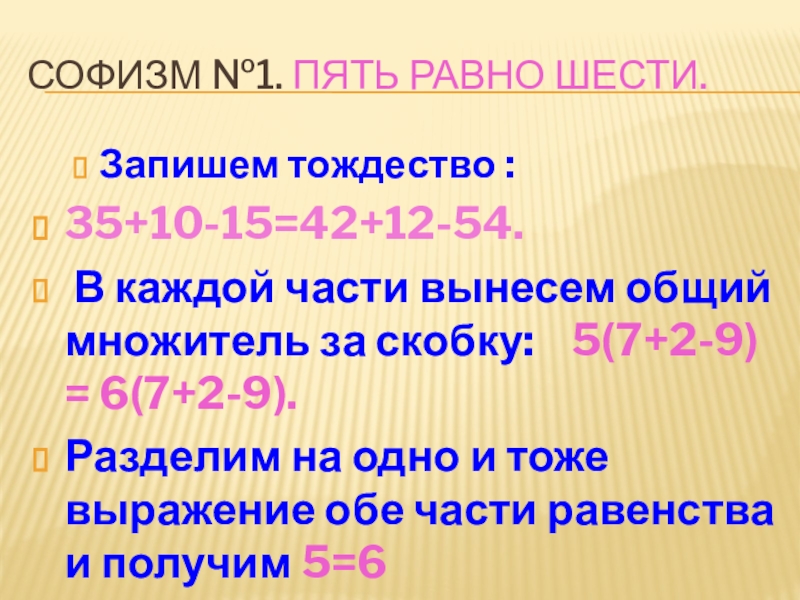 Слайд 10Софизм №1. Пять равно шести.