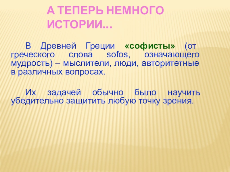 Слайд 5 В Древней Греции «софисты» (от греческого слова sofos, означающего мудрость) –
