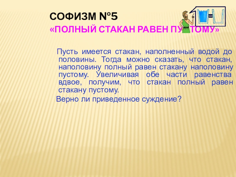 водой до половины. Тогда можно сказать, что стакан, наполовину полный равен стакану наполовину пустому. Увеличивая обе части равенства вдвое, получим, что стакан полный равен стакану пустому.