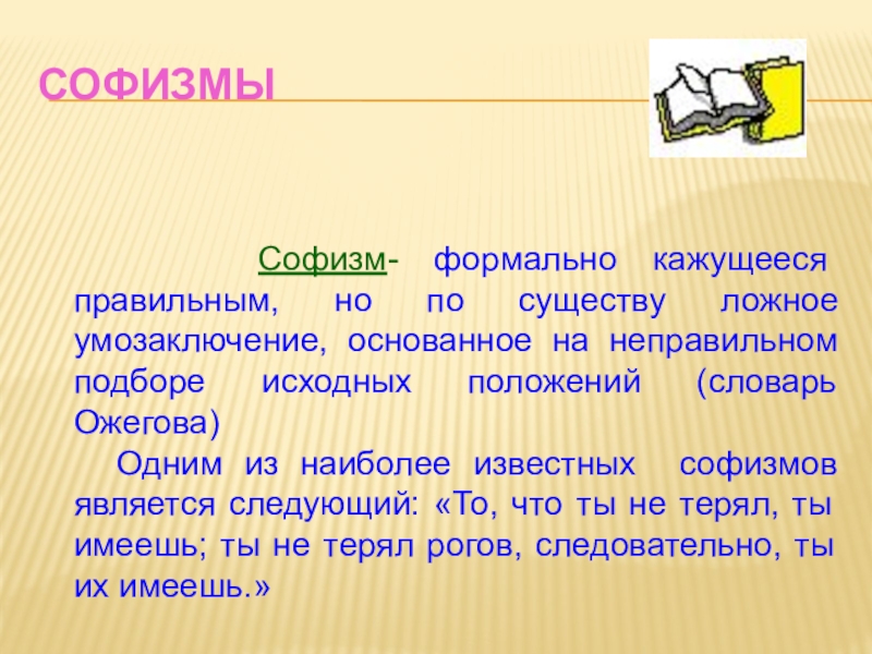 Слайд 6 Софизм- формально кажущееся правильным, но по существу ложное
