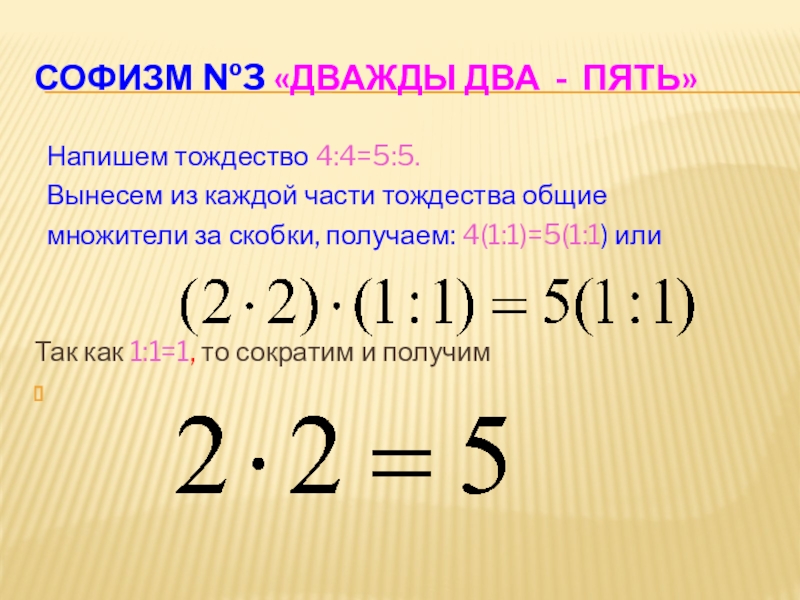Слайд 14Софизм №3 «Дважды два - пять»