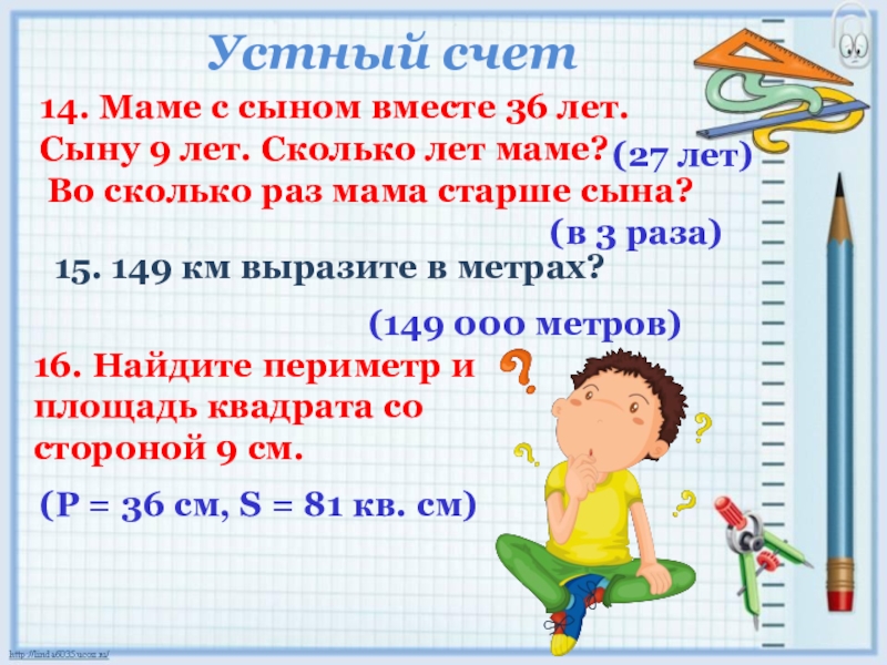 16. Найдите периметр и площадь квадрата со стороной 9 см.
