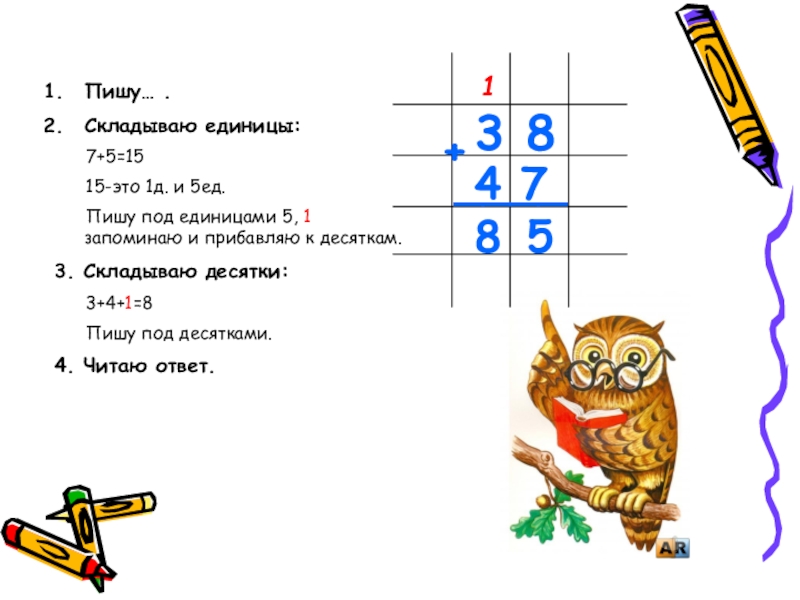 пиши под единицами единицы, а 1 десяток прибавляй к десяткам.