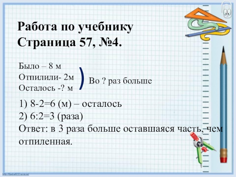 Ответ: в 3 раза больше оставшаяся часть, чем отпиленная.