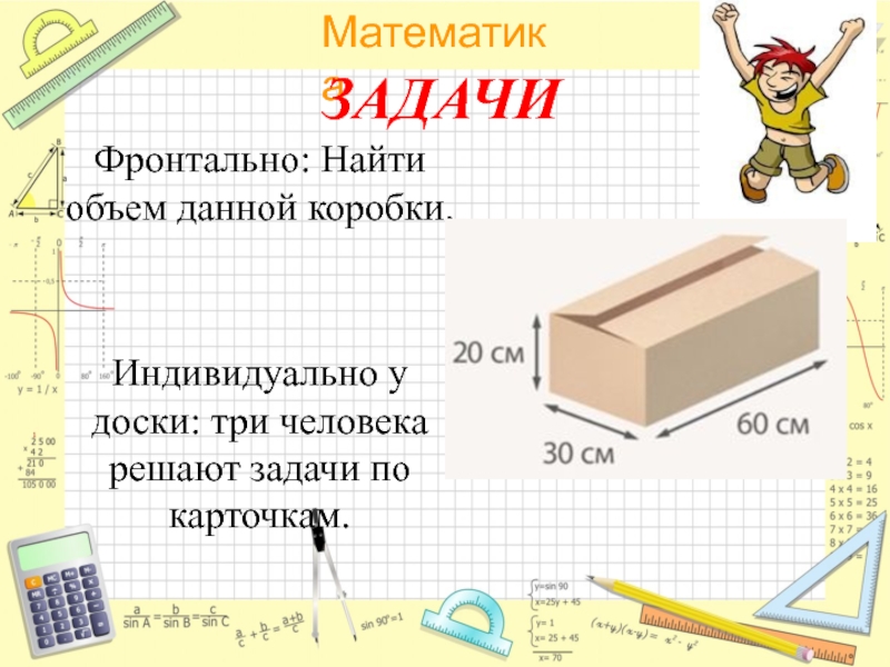 ЗАДАЧИФронтально: Найти объем данной коробки.Индивидуально у доски: три человека решают задачи по карточкам.