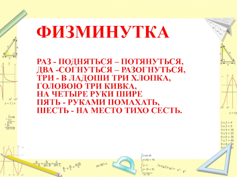 физминуткаРаз - подняться – потянуться,Два -согнуться – разогнуться,Три - в ладоши три хлопка,Головою три кивка,На четыре руки