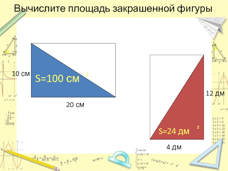 Вычислите площадь закрашенной фигуры20 см10 см4 дм12 дм