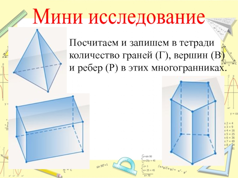 Мини исследованиеПосчитаем и запишем в тетради количество граней (Г), вершин (В)и ребер (Р) в этих многогранниках.