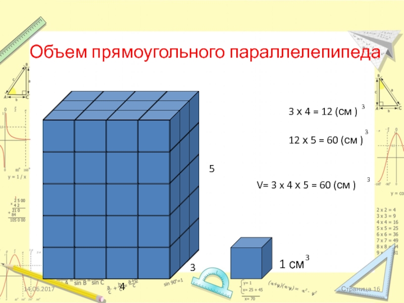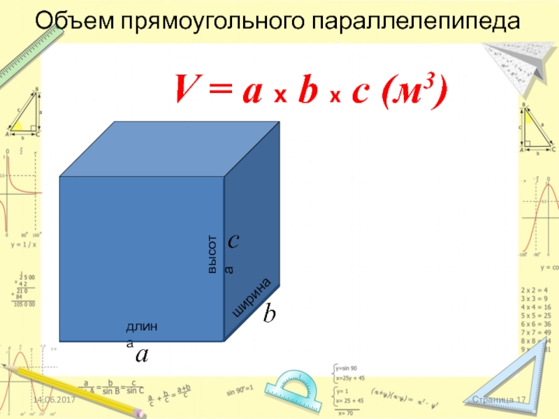 Страница Объем прямоугольного параллелепипедадлинааширинаbвысотасV = a х b x c (м3)