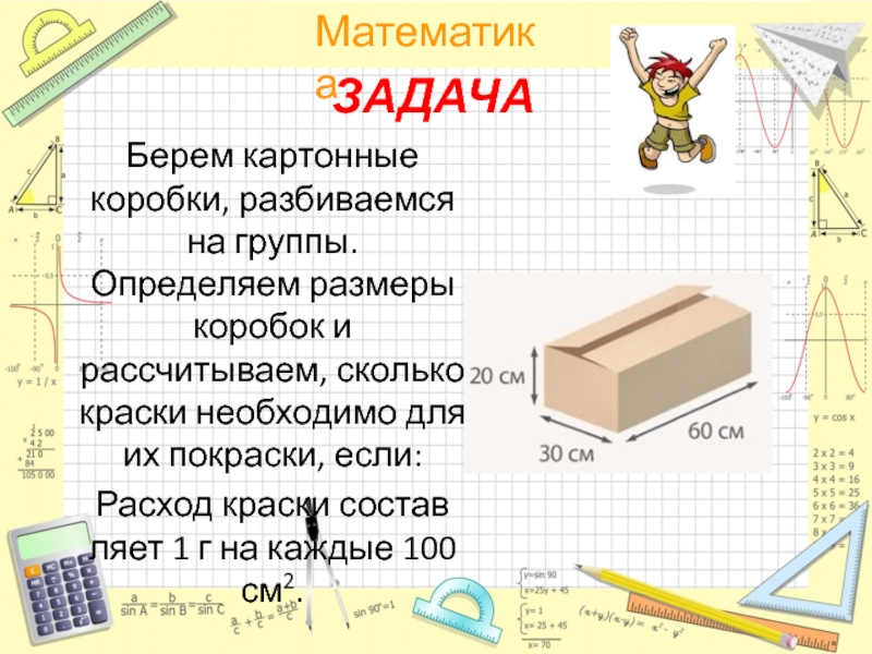 ЗАДАЧАБерем картонные коробки, разбиваемся на группы. Определяем размеры коробок и рассчитываем, сколько краски необходимо для их покраски,