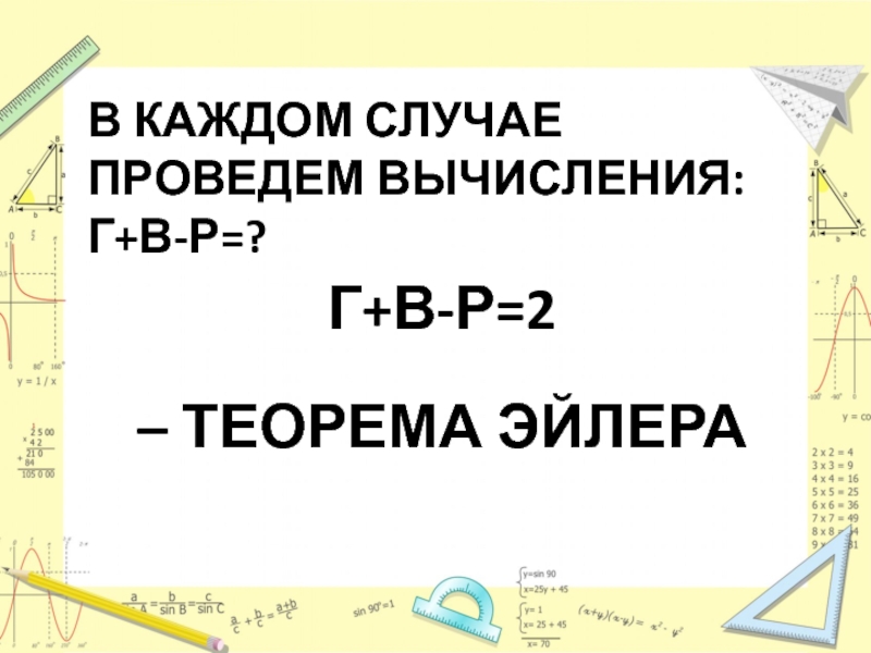 В каждом случае проведем вычисления: Г+В-Р=?Г+В-Р=2 – теорема Эйлера