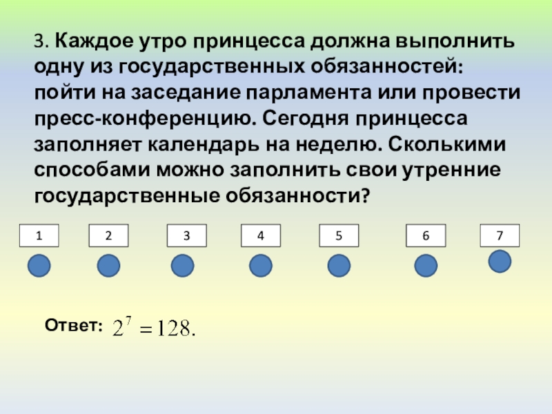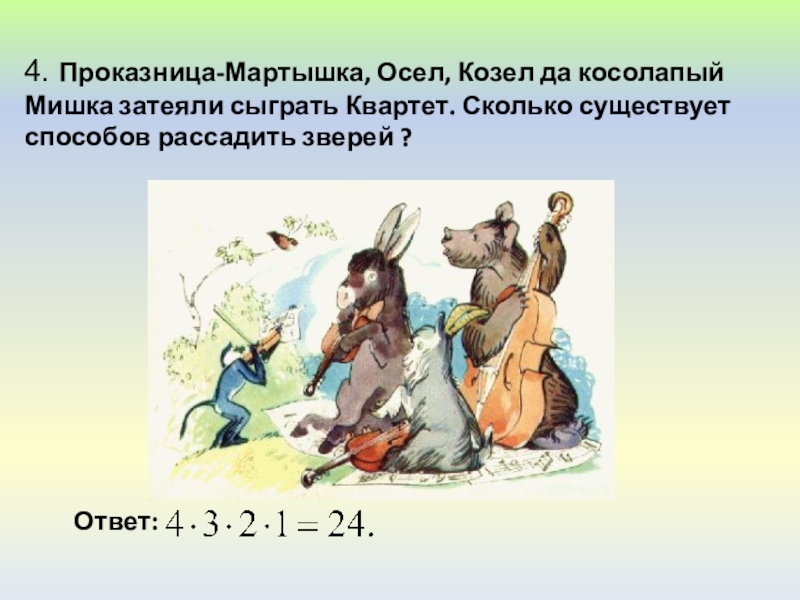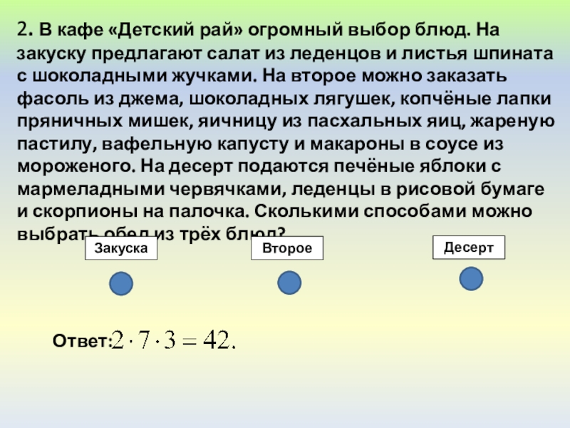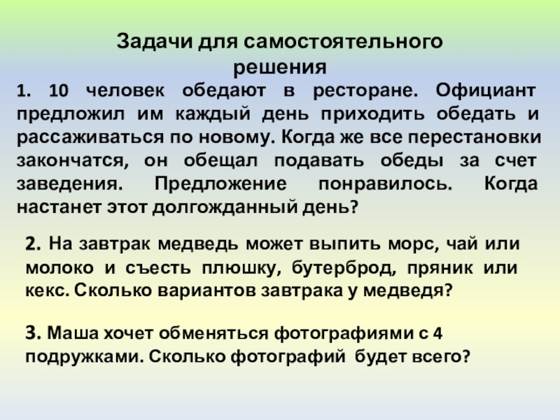 2. На завтрак медведь может выпить морс, чай или молоко и съесть плюшку, бутерброд, пряник или кекс. Сколько вариантов завтрака у медведя?