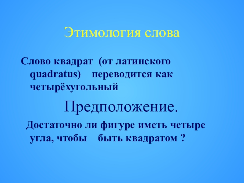 Этимология словаСлово квадрат (от латинского quadratus)  переводится как четырёхугольный