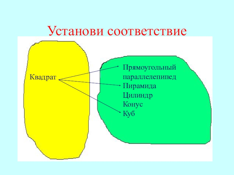 Установи соответствиеКвадратПрямоугольный параллелепипедПирамидаЦилиндрКонусКуб