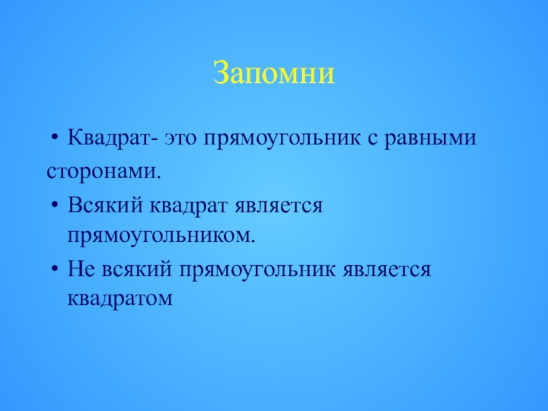 ЗапомниКвадрат- это прямоугольник с равнымисторонами.Всякий квадрат является прямоугольником.Не всякий прямоугольник является квадратом