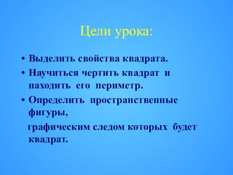 Цели урока:Выделить свойства квадрата.Научиться чертить квадрат и находить его периметр.Определить пространственные фигуры,   графическим следом которых