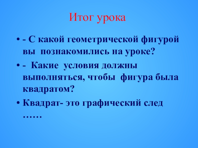 Итог урока- С какой геометрической фигурой вы познакомились на уроке?- Какие условия должны выполняться, чтобы фигура была
