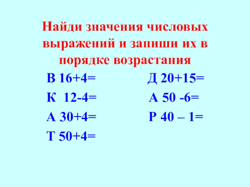 Слайд 4Найди значения числовых выражений и запиши их в порядке возрастания