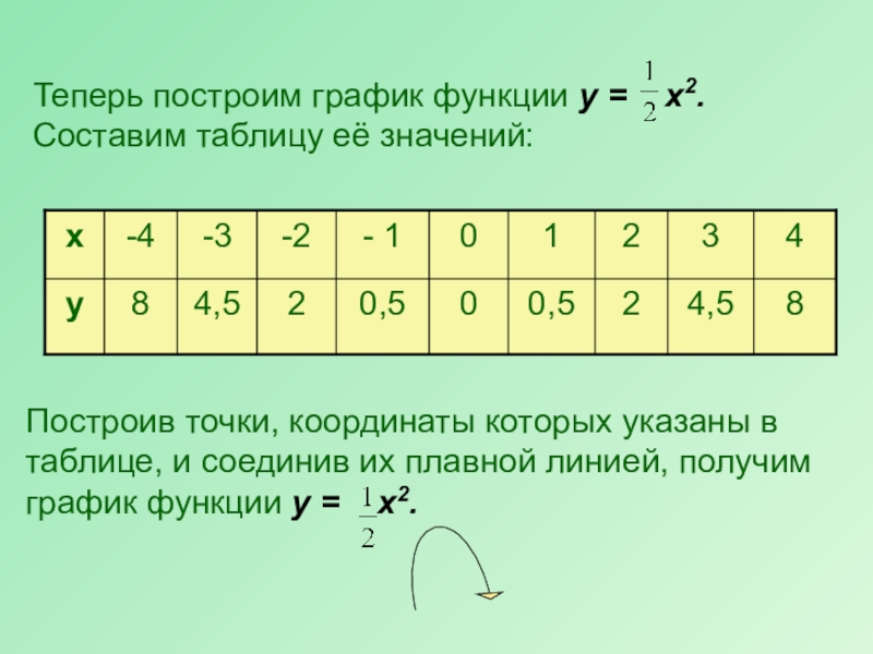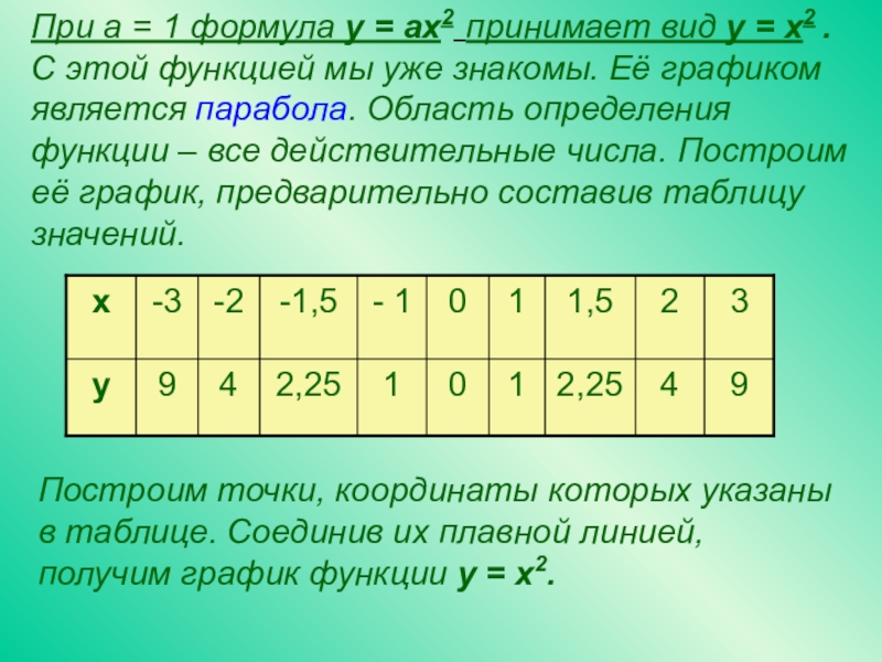 Построим точки, координаты которых указаны в таблице. Соединив их плавной линией, получим график функции у = х2.