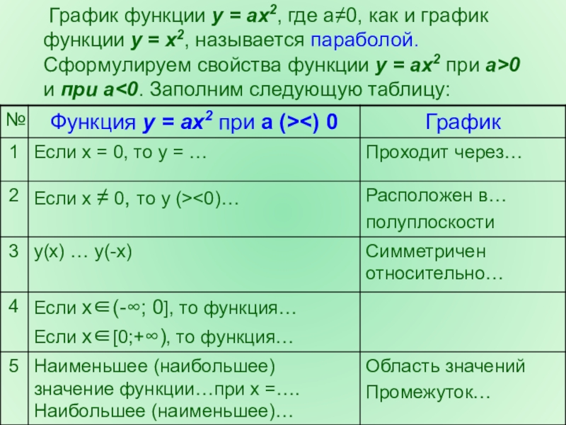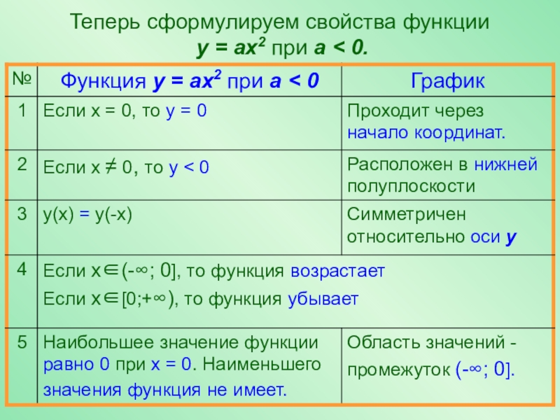 а < 0. Построим график функции у = - х2 , для чего составим таблицу значений этой функции.