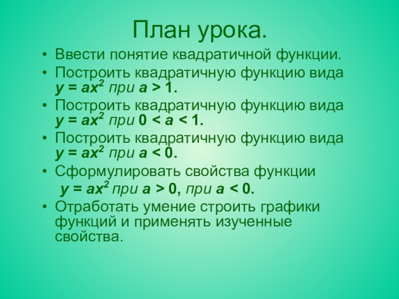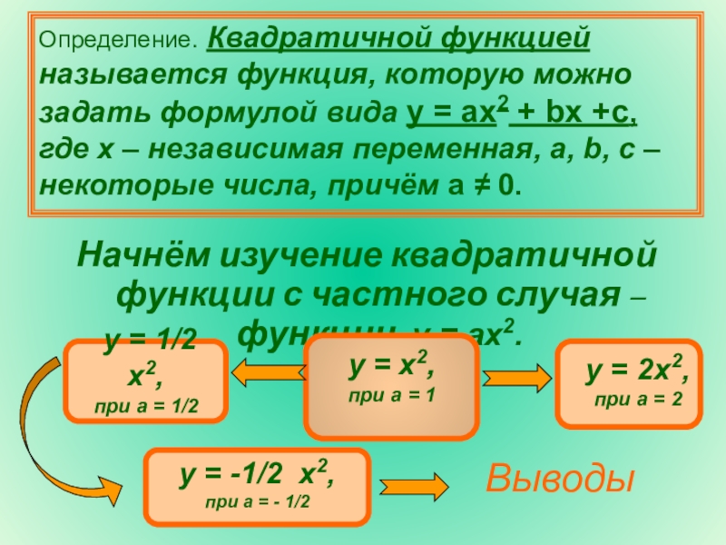 Определение. Квадратичной функцией называется функция, которую можно задать формулой вида y = ax2 + bx +c, где х – независимая переменная, а, b, c – некоторые числа, причём а ≠ 0.