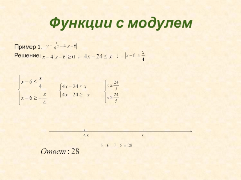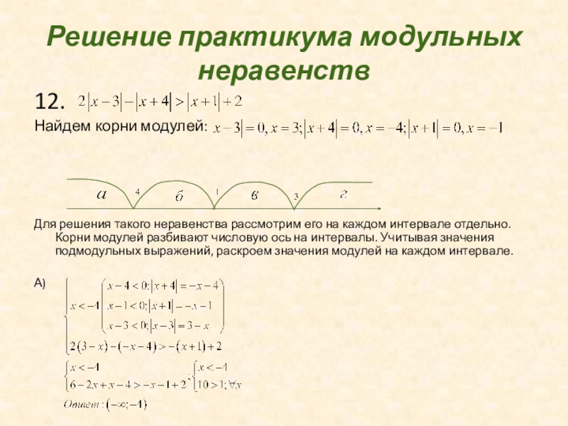 на каждом интервале отдельно. Корни модулей разбивают числовую ось на интервалы. Учитывая значения подмодульных выражений, раскроем значения модулей на каждом интервале.