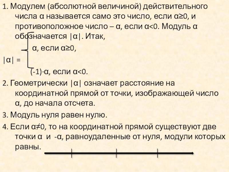 Слайд 61. Модулем (абсолютной величиной) действительного числа α называется само это число,