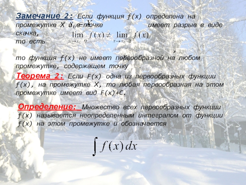 Теорема 2: Если F(x) одна из первообразных функции f(x), на промежутке Х, то любая первообразная на этом промежутке имеет вид F(x)+C.