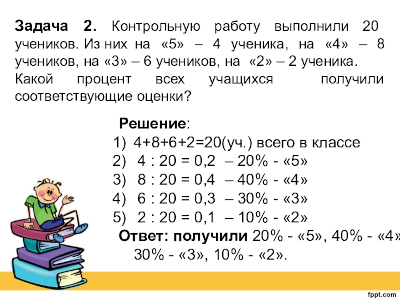 Ответ: получили 20% - «5», 40% - «4», 30% - «3», 10% - «2».