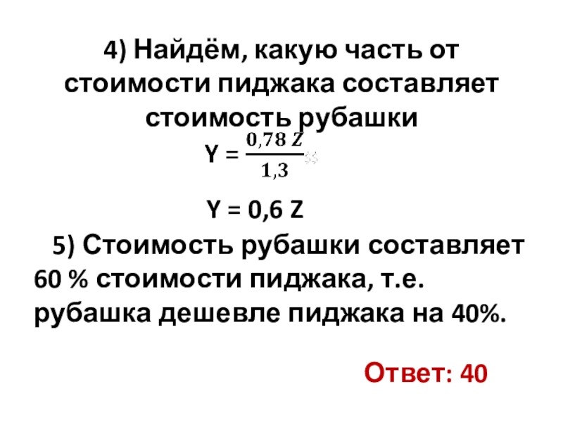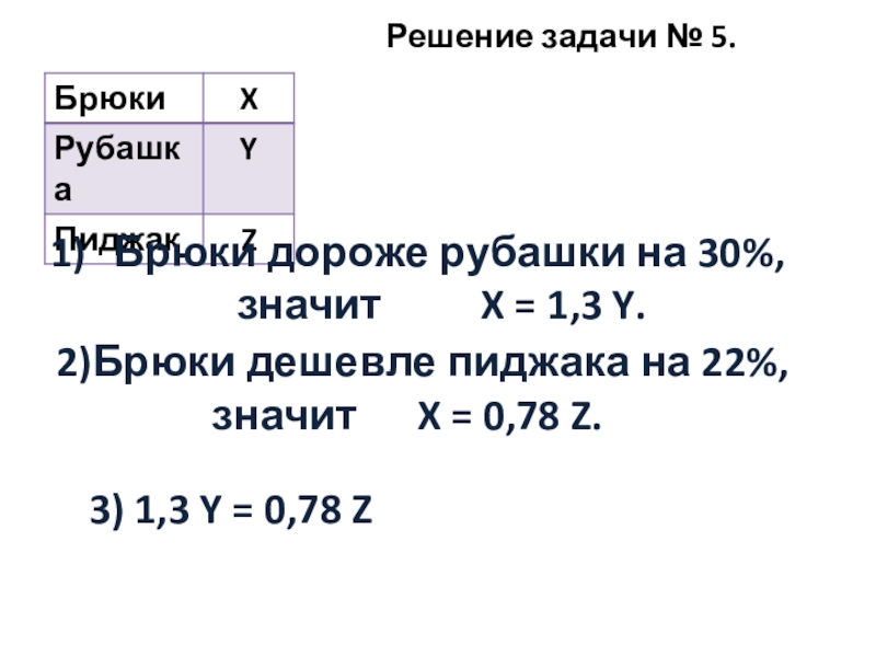 2)Брюки дешевле пиджака на 22%, значит X = 0,78 Z.
