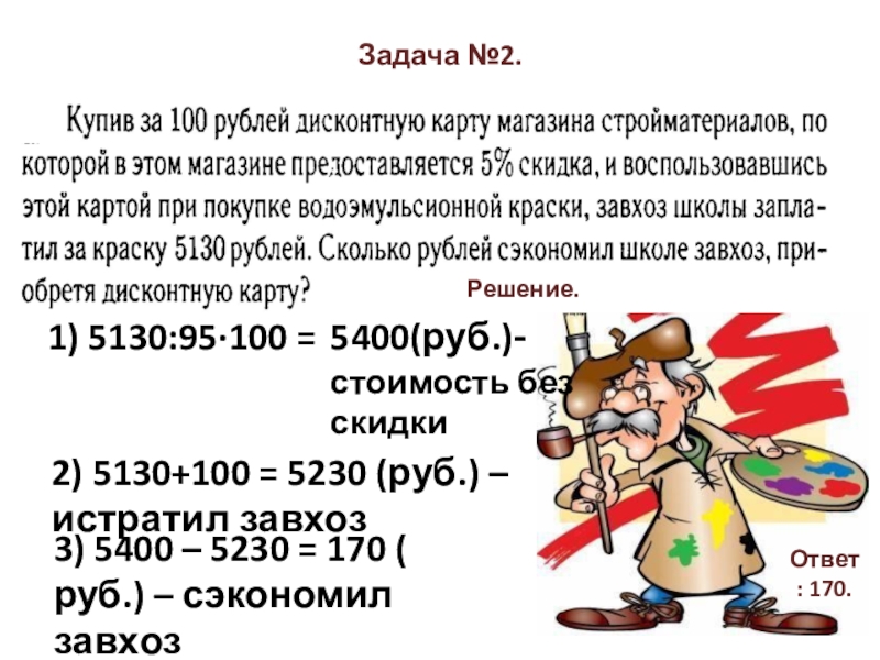 3) 5400 – 5230 = 170 ( руб.) – сэкономил завхоз