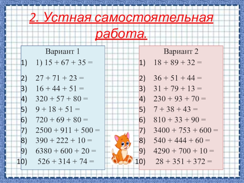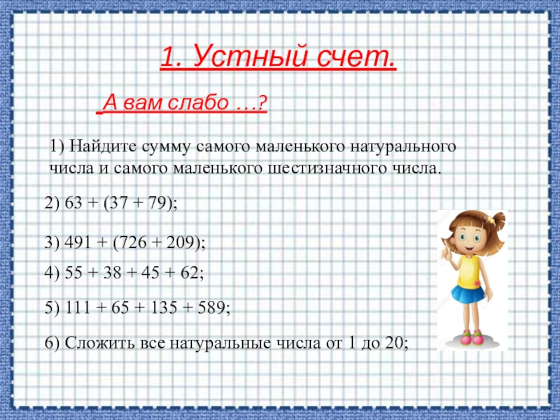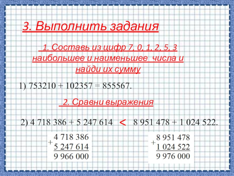 1. Составь из цифр 7, 0, 1, 2, 5, 3 наибольшее и наименьшее числа и найди их сумму