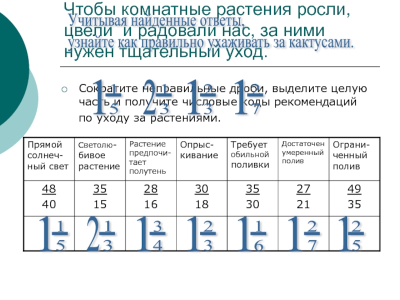 Сократите неправильные дроби, выделите целую часть и получите числовые коды рекомендаций по уходу за растениями.