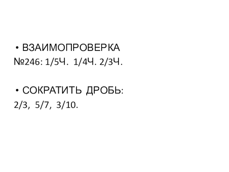 ВЗАИМОПРОВЕРКА№246: 1/5Ч. 1/4Ч. 2/3Ч. СОКРАТИТЬ ДРОБЬ:2/3, 5/7, 3/10.