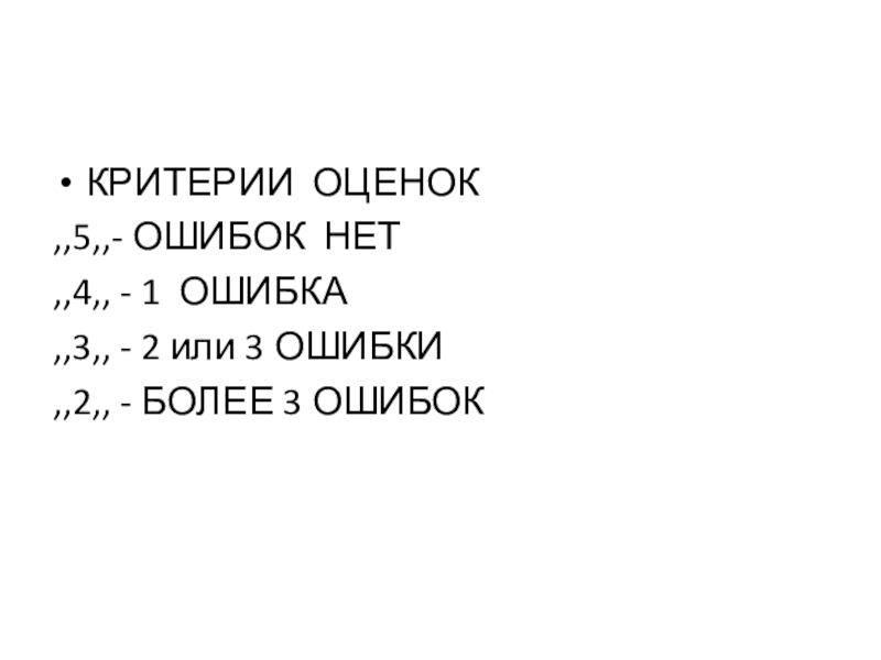 КРИТЕРИИ ОЦЕНОК,,5,,- ОШИБОК НЕТ,,4,, - 1 ОШИБКА,,3,, - 2 или 3 ОШИБКИ,,2,, - БОЛЕЕ 3 ОШИБОК