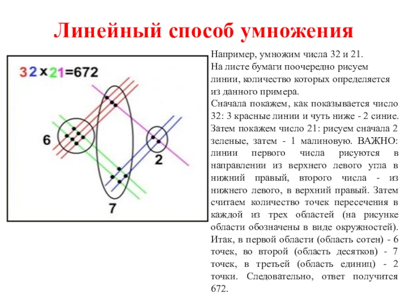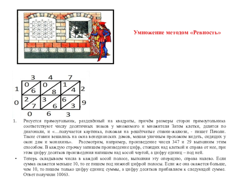 Рисуется прямоугольник, разделённый на квадраты, причём размеры сторон прямоугольника соответствуют числу десятичных знаков у множимого и множителя Затем клетки, делятся по диагонали, и «…получается картинка, похожая на решётчатые ставни-жалюзи, - пишет Пачоли. Такие ставни вешались на окна венецианских домов, мешая уличным прохожим видеть, сидящих у окон дам и монахинь». Рассмотрим, например, произведение чисел 347 и 29 выполним этим способом. В каждую строчку запишем произведение цифр, стоящих над клеткой и справа от нее, при этом цифру десятков произведения напишем над косой чертой, а цифру единиц – под ней.