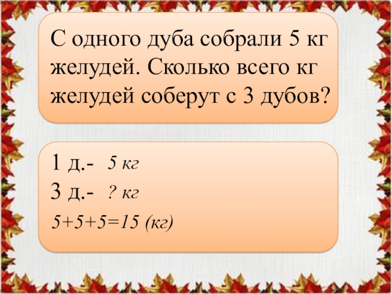 Слайд 11С одного дуба собрали 5 кг желудей. Сколько всего кг желудей