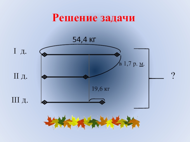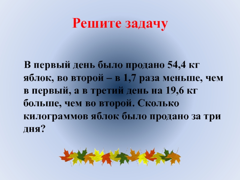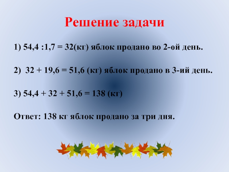 1) 54,4 :1,7 = 32(кг) яблок продано во 2-ой день.