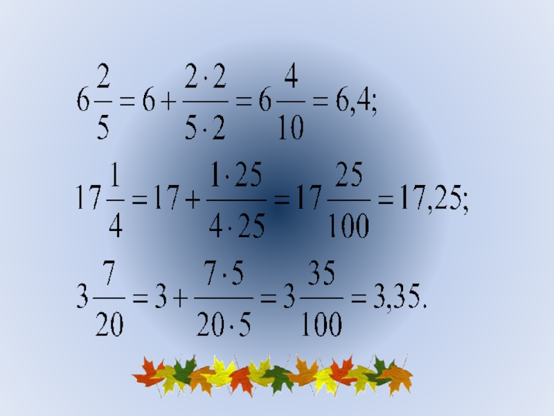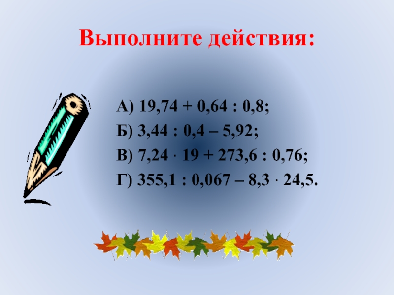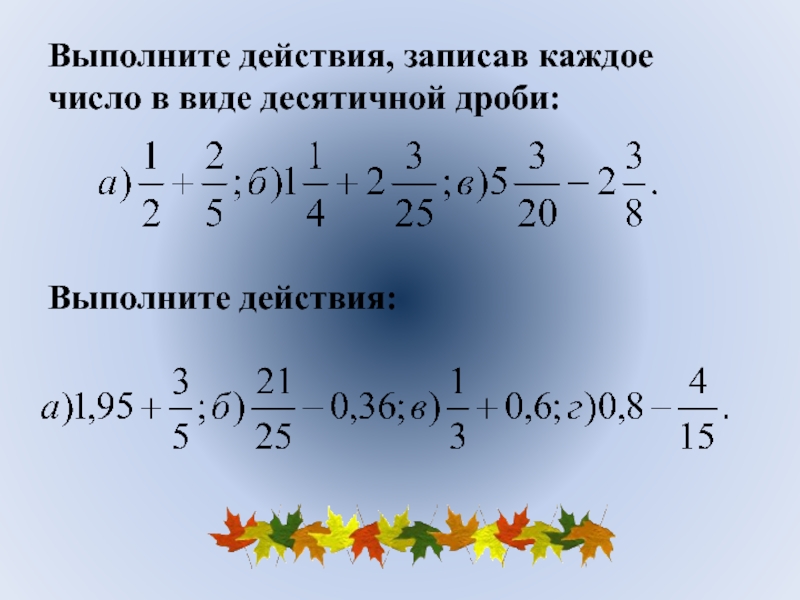 Слайд 20Выполните действия, записав каждое число в виде десятичной дроби: