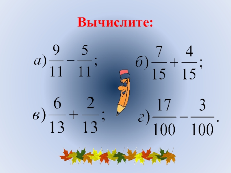одинаковы, то для того, чтобы сложить дроби, надо сложить их числители, а для того, чтобы вычесть дроби, надо вычесть их числители (в том же порядке). Полученная сумма или разность будет числителем результата; знаменатель останется тем же.